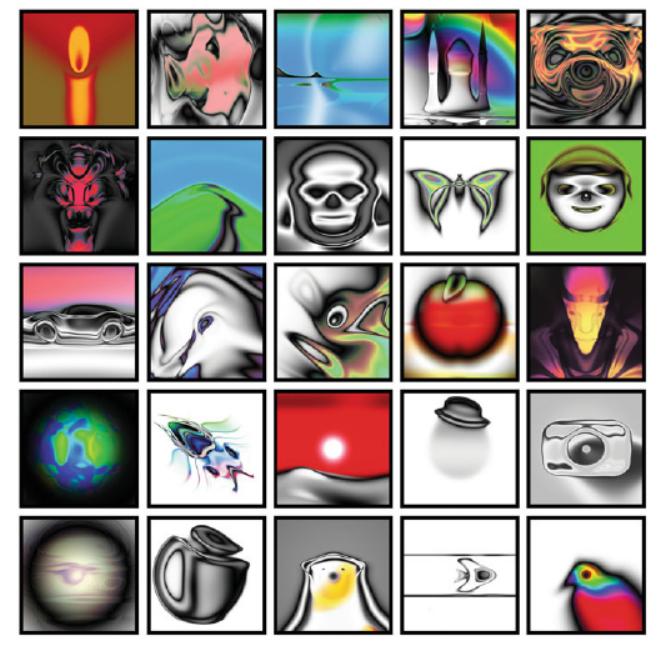 虽然每个用户都是从乱涂乱画开始的,但渐渐我们看到了一些熟悉的、可辨认的图片,比如蝴蝶、头颅、行星、汽车等等。我们进而得出一些有意思的洞察,比如你孵化出了一张酷似车的图片,但你最初并不是以此为目标的。而如果你以此为目标,你根本得不出这张照片。这是矛盾之处。遵循这样的原则,我们提出了基于新奇性探索、而非目标驱动的搜索算法。