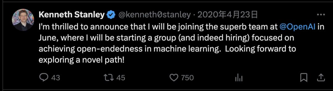 当然,我在 OpenAI 也不仅仅是因为 Sam,内部很多人都有开放的想法。比如 Jeff Clune(前 OpenAI 研究团队负责人),他在我们之前加入 OpenAI。他也觉得,开放性探索是一个有趣且值得投资的领域。我们在那个时候达成了共识,所以我们被雇佣了。