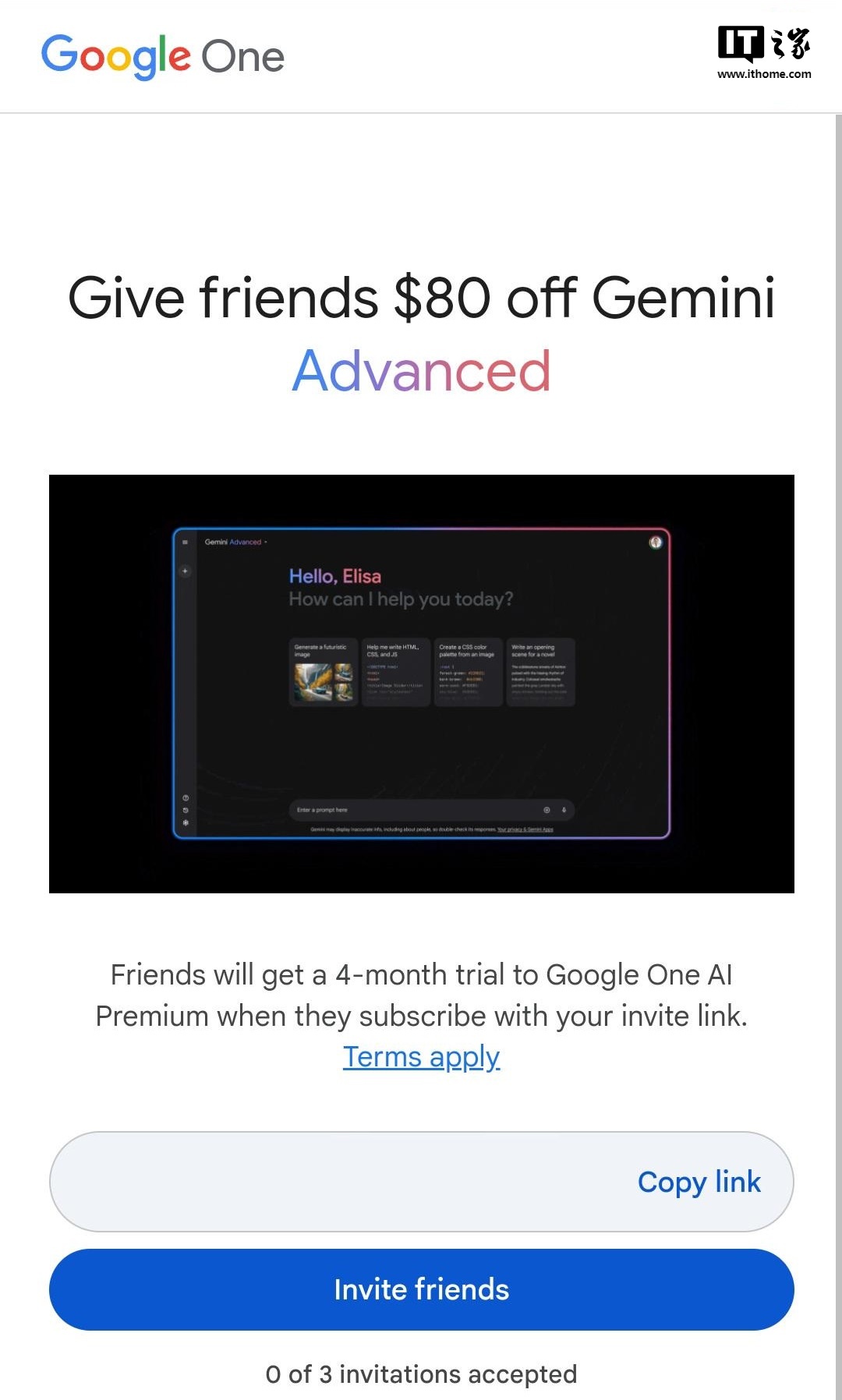IT之家 9 月 7 日消息,谷歌现开启了一项新活动,允许部分 Gemini Advanced 高级订阅用户邀请朋友享受相同的福利。