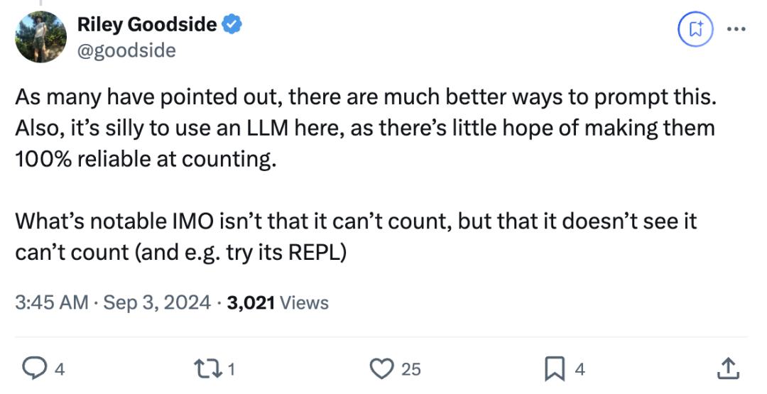 在我看来,重要的不是它无法计数,而是它没意识到自己的计数问题(例如,没有尝试使用其REPL功能)。