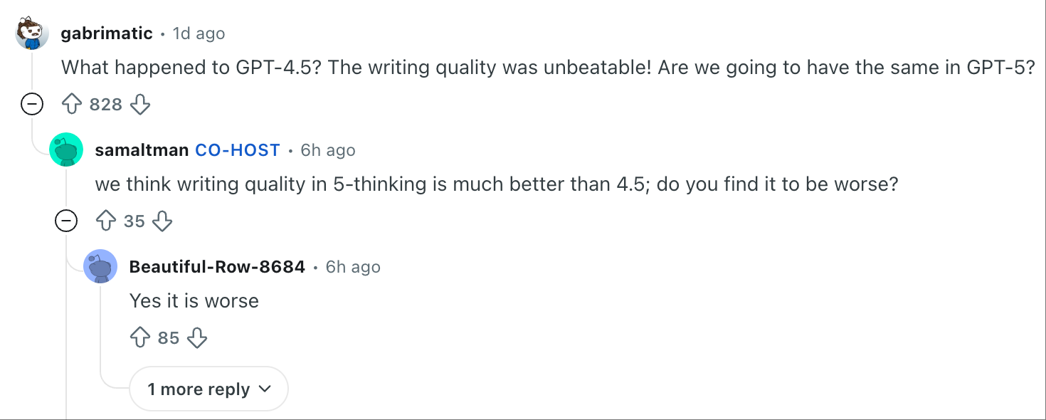 在活动中,奥特曼曾回应一位Reddit用户的问题。他指出,OpenAI认为GPT-5的某个版本在“写作质量”上优于GPT-4.5。随后他问道:“你觉得它更差吗?”接着,用户们立刻接二连三地回答说:“是的。”(文章来源:凤凰网)