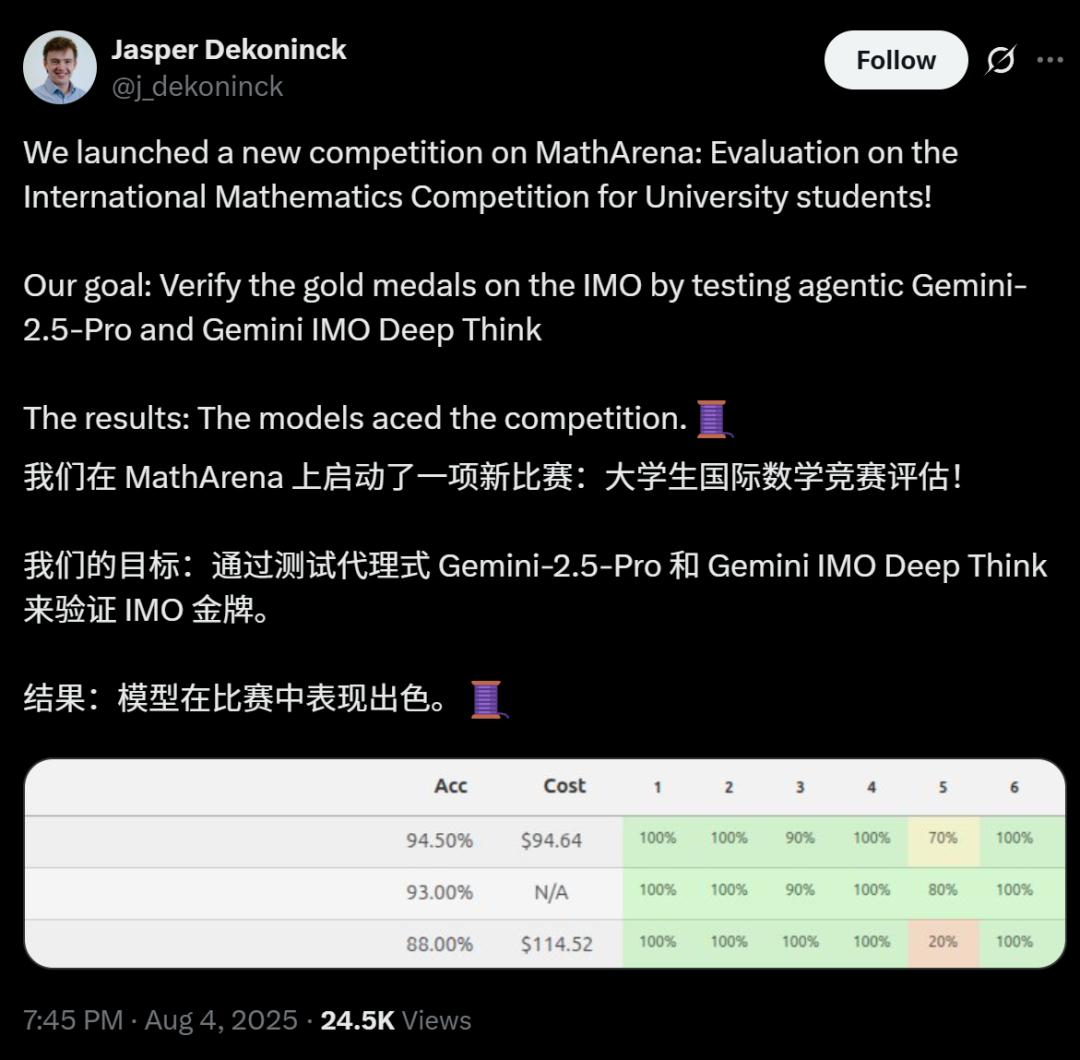 近日,在MathArena上,苏黎世联邦理工学院SRI实验室博士生Jasper Dekoninck,启动了一项新比赛:大学生国际数学竞赛(IMC)。