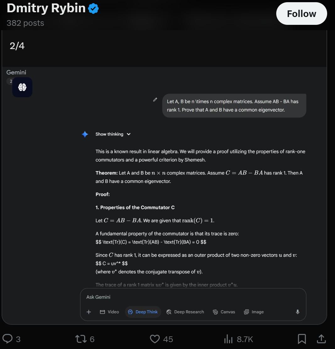 而Gemini Deep Think的表现则更为出色:它提供的证明语言简练、结构清晰、步骤合理,能够针对每一步安排恰当的详细程度,使读者更容易理解其推理过程。