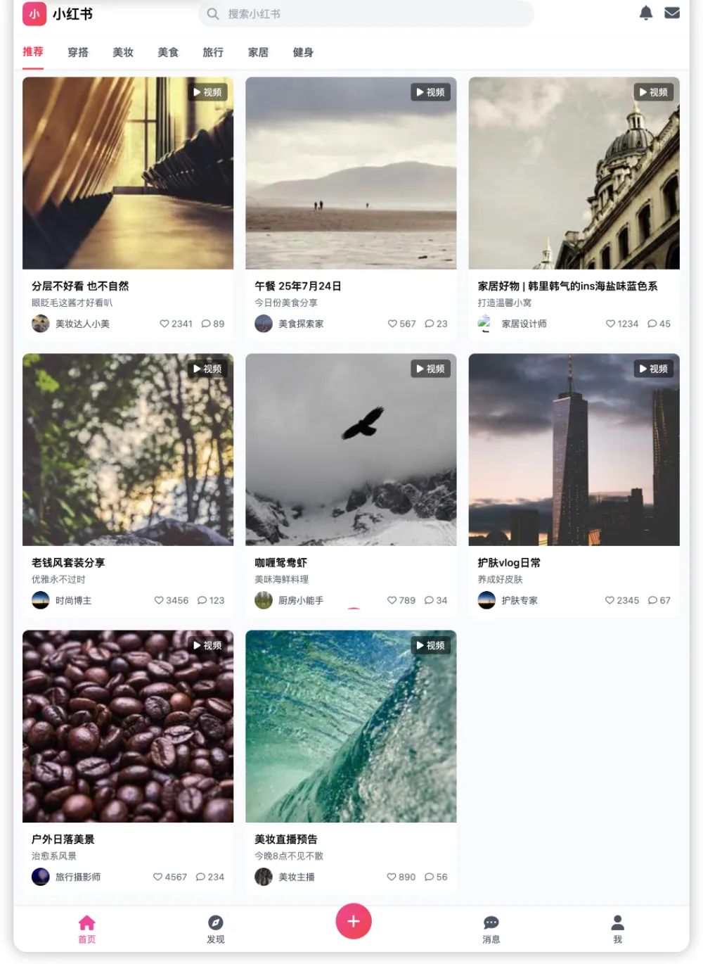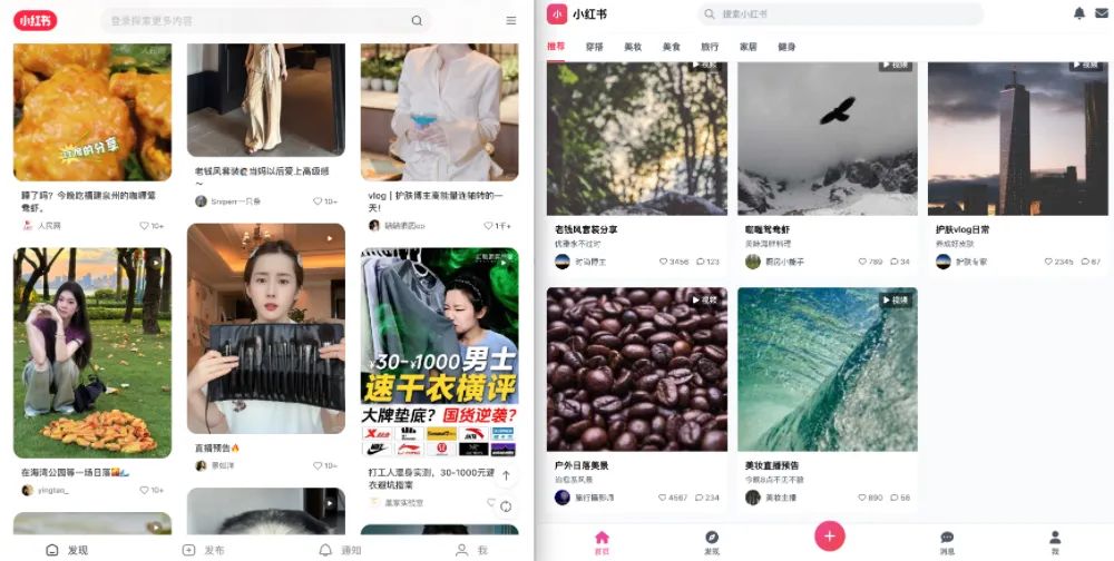 但在瀑布流对齐效果上未能还原,缺少小红书“精髓”的布局感。此外,该版本并未实现交互功能,可能是截图内容无法体现动态操作所致,上传视频或许可以改善。