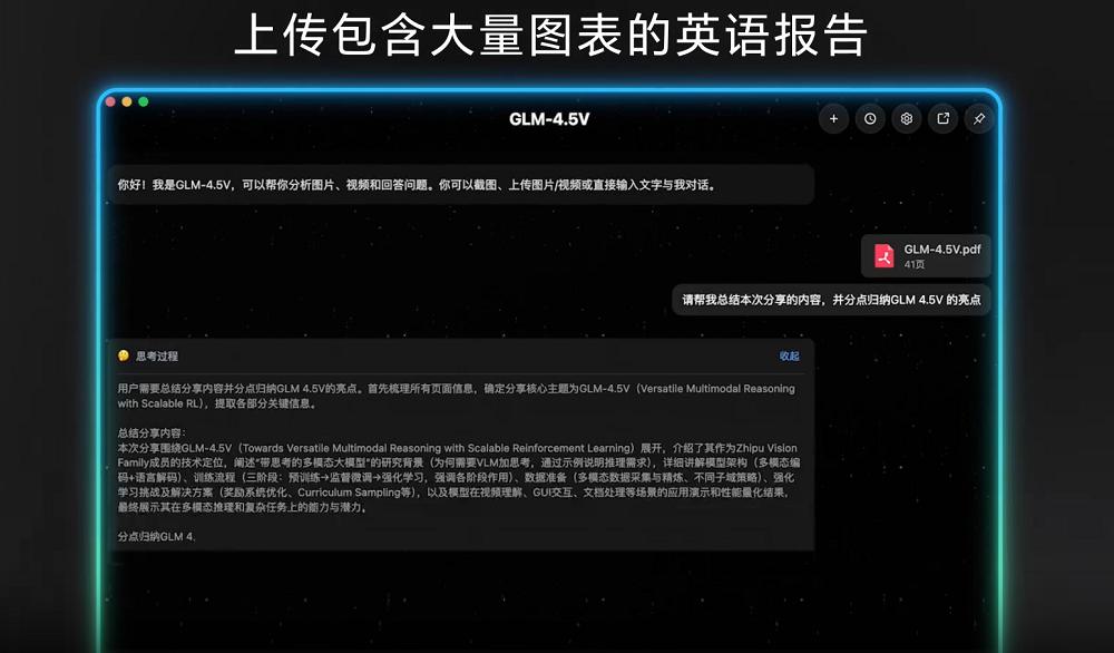 在PPT、PDF场景,GLM-4.5V可阅读含有大量图表的复杂长文本,能够对文本进行总结、翻译、图表提取等操作。