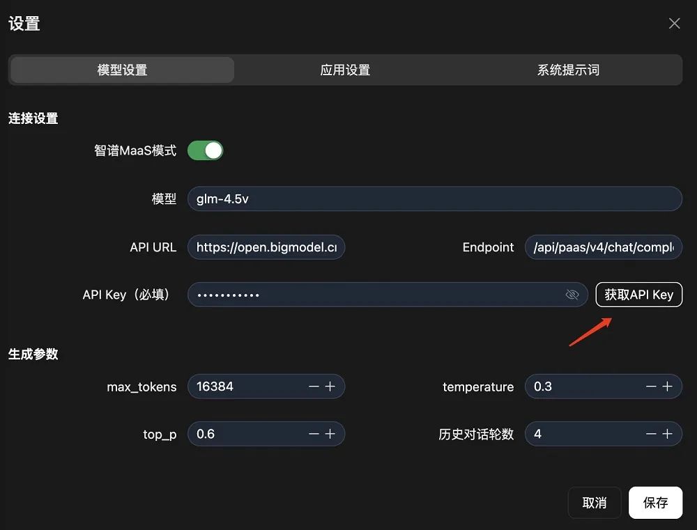 要使用模型,用户需要提供GLM-4.5V的API密钥,可在智谱的开放平台获得。