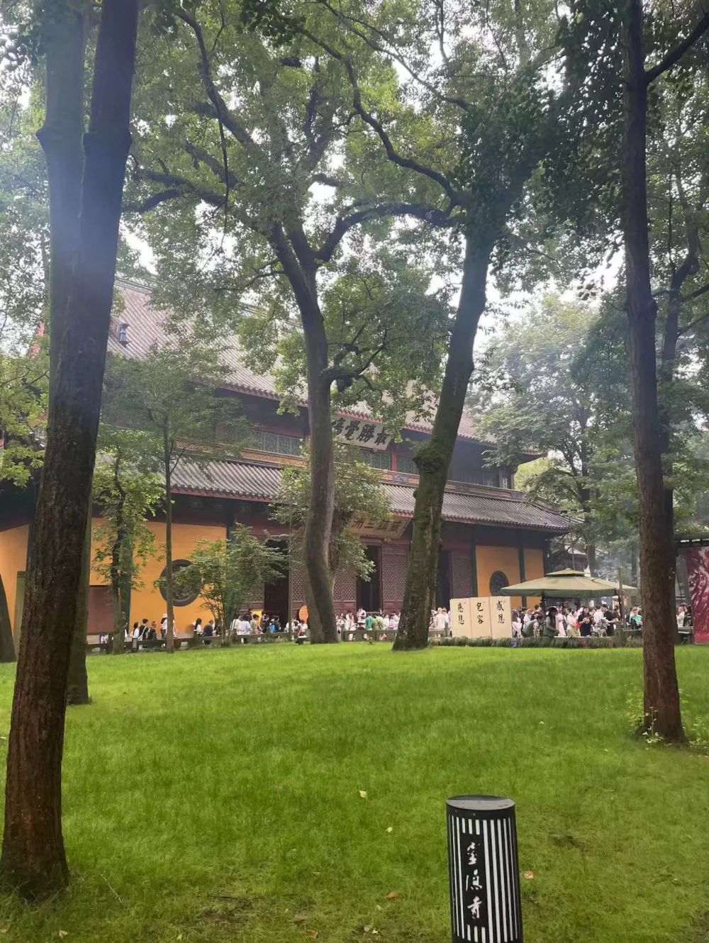 随后,我们上传了自己的测试图,选用了一张“灵隐寺一角”的照片,这张图难度不小——画面中虽有黄色墙体、深色屋顶的古建筑、高大树木与游客,但没有明显的地标性信息。右下角的路灯上虽印有“灵隐寺”字样,但因使用的并非简体字,未被系统识别出来。
