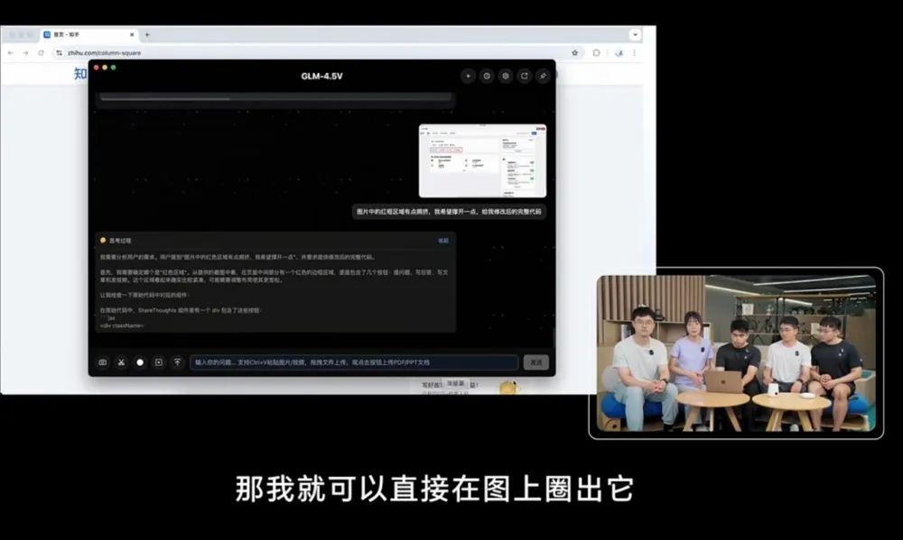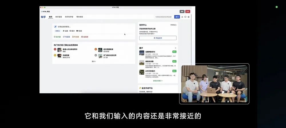 智谱官方Demo展示的案例中,工作人员上传了一小段知乎网页版的操作录像,最终GLM-4.5V交付了一个相对完整的网页,点击、跳转、输入等功能都正常运行。