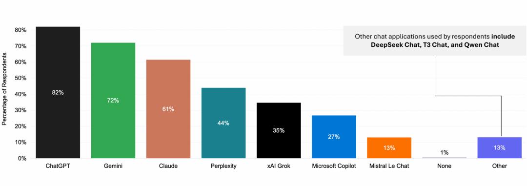 在最常用的大模型聊天工具上,ChapGPT的先发优势依旧,而Gemini和Claude紧随其后。