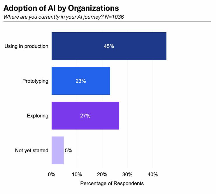 横跨欧美亚上千家企业的最新调研揭示,生成式AI已不再只是研发试验品,45%的企业已将其部署到生产环境中。