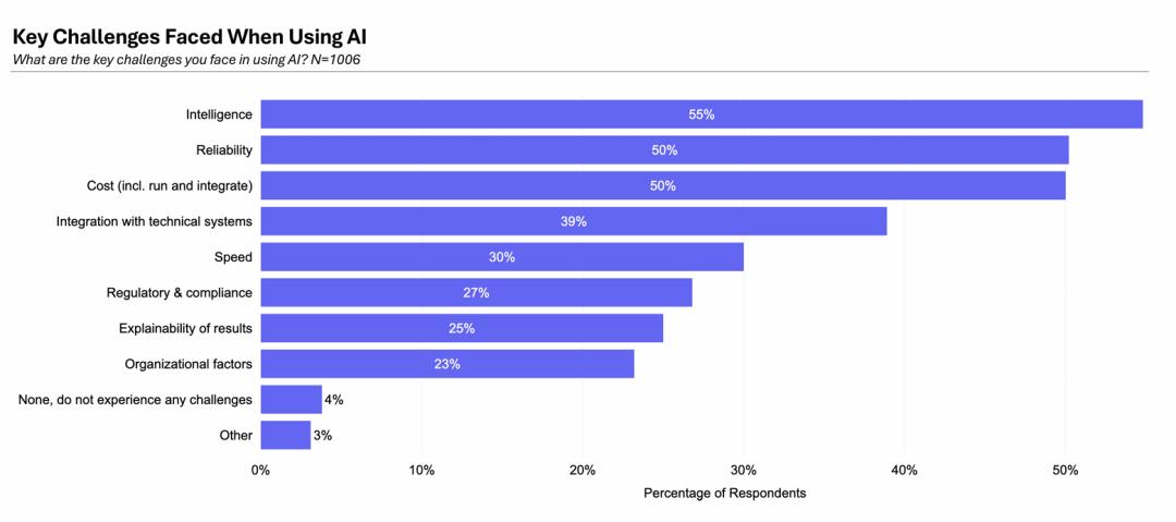 与此同时,可靠性、成本和智能水平仍是AI落地的三大「拦路虎」。