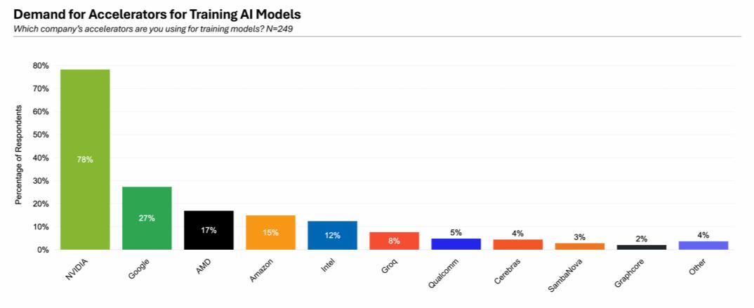 在大模型的训练硬件上,英伟达还是占据了绝对优势地位(78%),其次用到较多的是谷歌的TPU和苏妈的AMD。