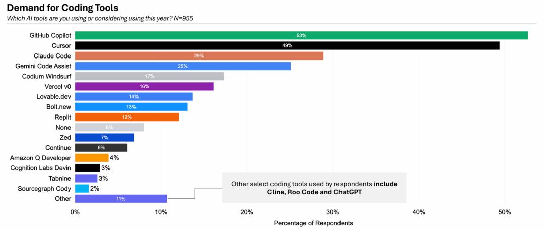 而在大模型编程助手这一定制化赛道上,用的最多还是Copliot和Curser,而国产的工具如Trace等则没有被统计。