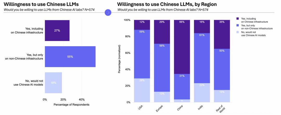 中国模型亦受全球企业谨慎接纳——55%的受访者愿使用,但仅限非中国基础设施。