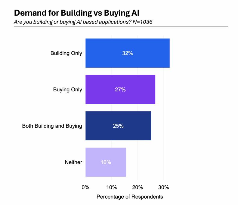 至于人们如何为AI付费,32%的受访者会构建定制化的大模型,27%只是通过api购买标准的大模型服务,而25%的受访者既要又要,而16%的受访者是白嫖党。