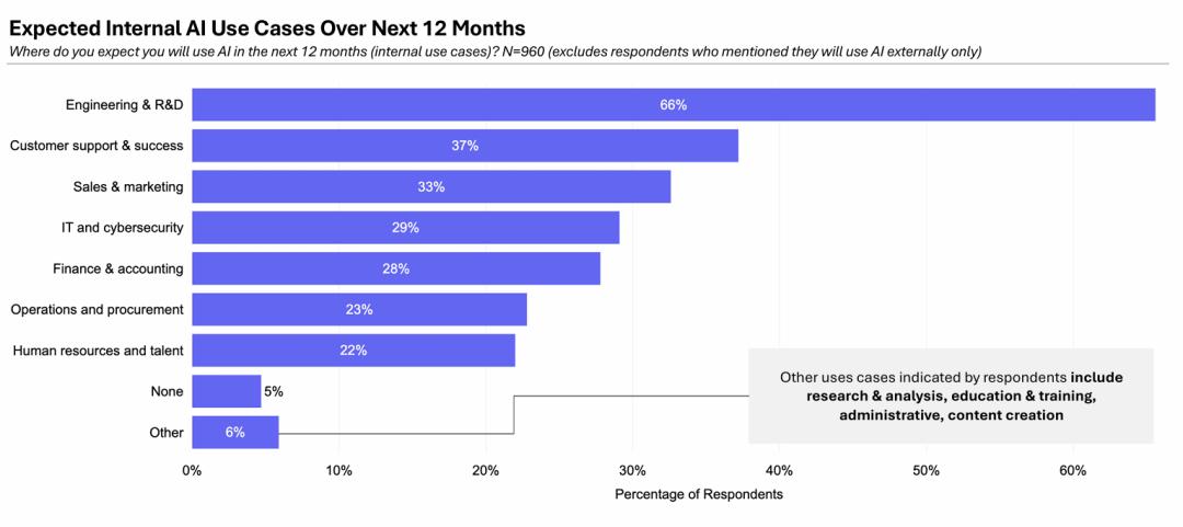 在对未来的12个月的AI使用的预期,大部分受访者(66%)希望AI能被用于工程及研发中,其次是用于客户支持(37%)及销售(33%)中。