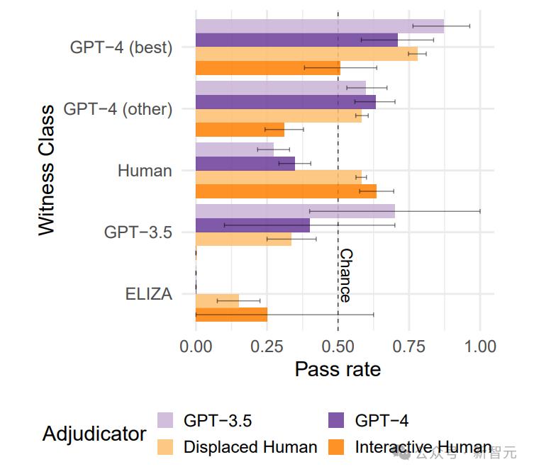 与反向图灵测试类似,表现最佳的GPT-4参与者的通过率高于人类参与者。