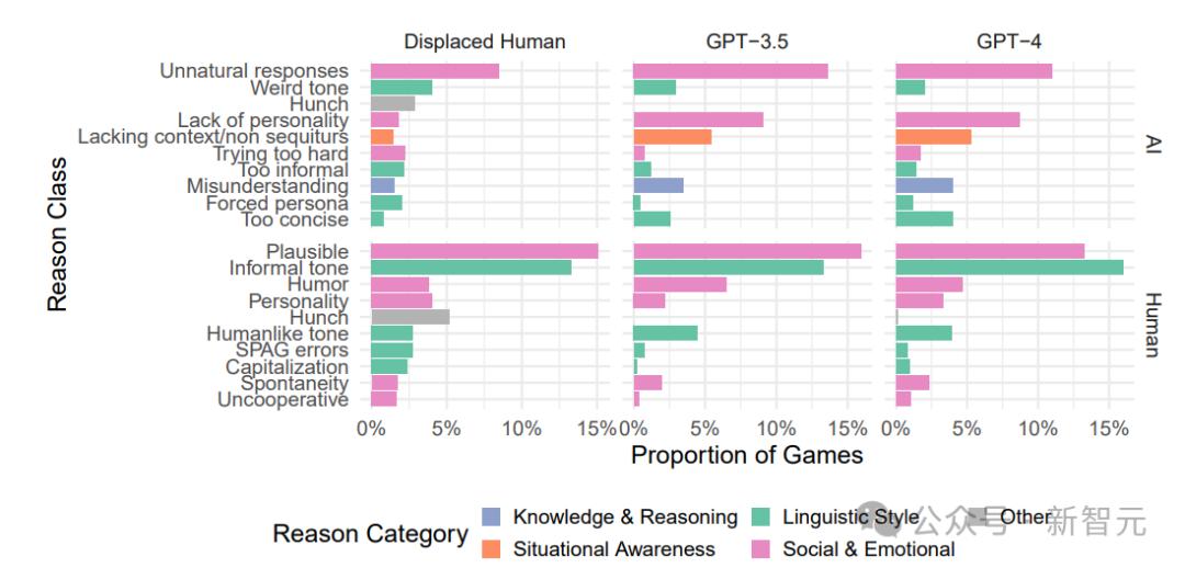AI裁定者在判断时,更多地关注对话者是否展示出人类特有的社会情感特质,如个性的缺失。而人类裁定者的理由分布则相对更均衡,涵盖多个不同的类别。
