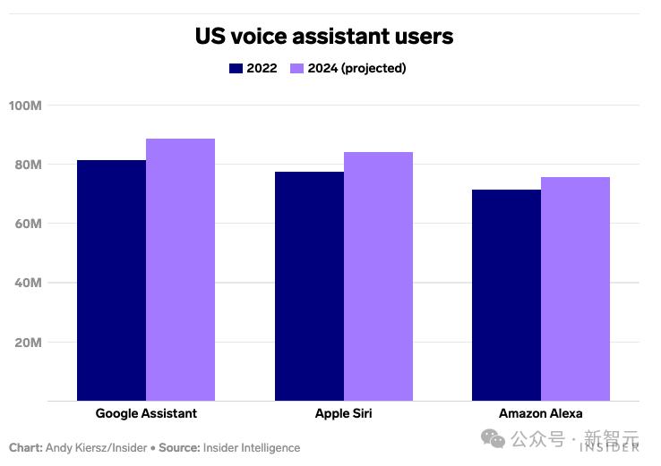 根据Insider Intelligence的统计,在美国,Google Assistant今年的用户数量预计将达到8880万,其次是 Siri的8420万。Alexa的用户数量位居第三,约为7560万。