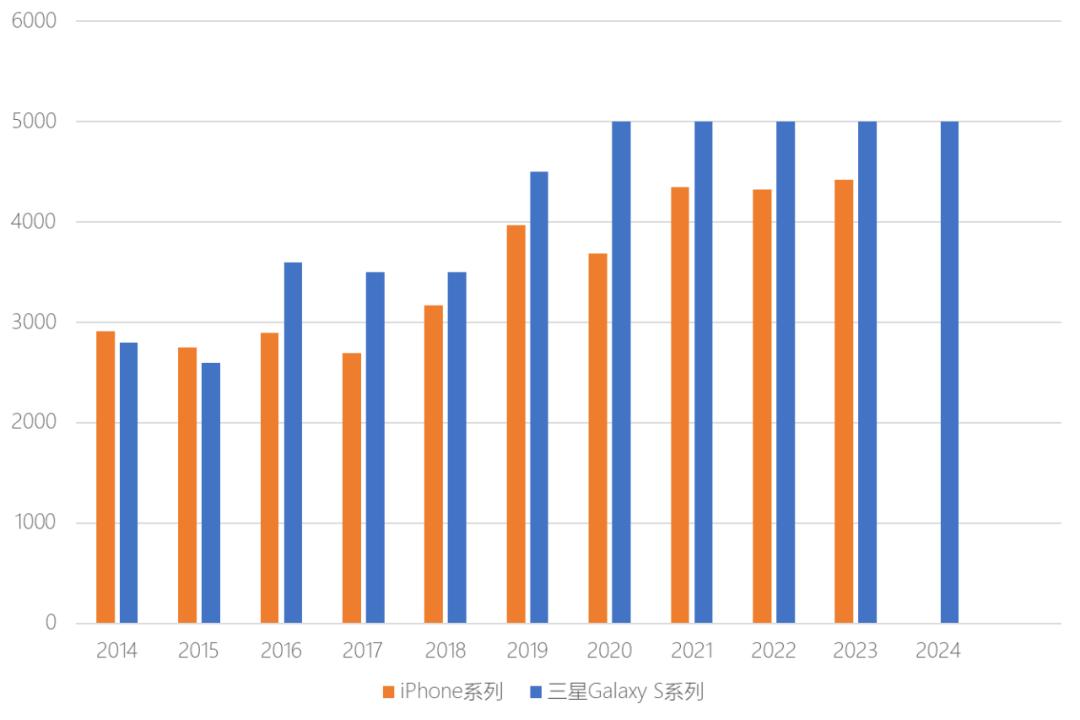 注:电池容量单位mAh,每年取该系列电池容量最高的机型数据