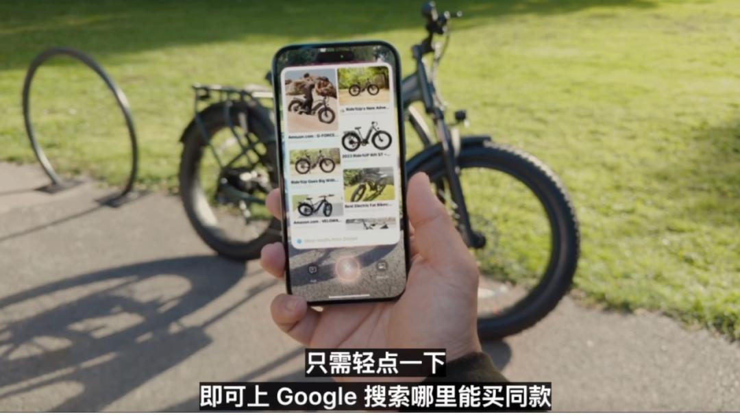 该功能也支持和第三方 APP 联动,比如,看到你喜欢的自行车,只需点击一下,即可快速Google到类似的自行车并购买。