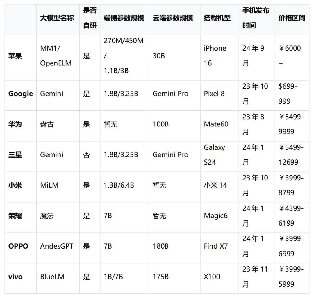 除了苹果,去年以来,各大手机厂商已经陆续发布了其端侧大模型的产品: