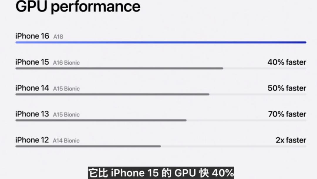 苹果的新款iphone16搭载了更快的CPU、GPU,且在能耗上有更好的表现。以GPU为例,A18芯片是四前iphone 12的A14芯片速度的2倍。