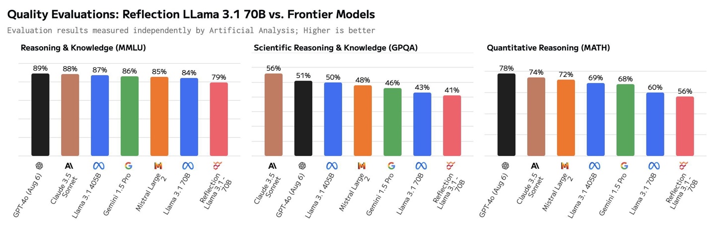 IT之家 9 月 11 日消息,科技媒体 The Decoder 昨日(9 月 10 日)报道,对比平台 Artificial Analysis 相关数据表明,Reflection 70B AI 模型在基准测试中的表现,实际上不及 Meta 的 LLaMA-3.1-70B。