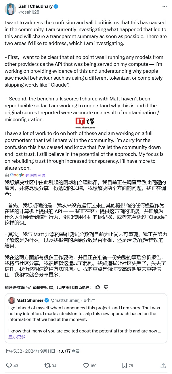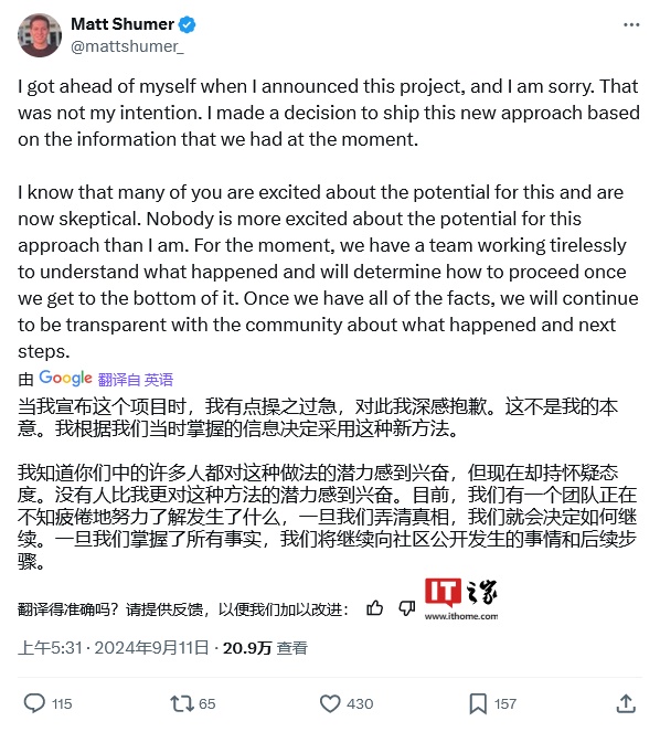针对 AI 模型基准测试结果不佳,Reflection 公司首席执行官马特・舒默(Matt Shumer)表示,上传模型权重至 Hugging Face 时遇到问题,所使用的权重是多个不同模型的混合体,而他们内部托管的模型则显示出更佳的结果。