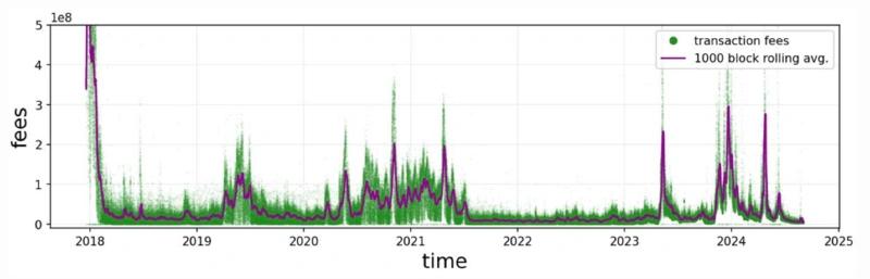 下图展示了过去六年比特币网络的手续费波动情况。我不相信在这样不稳定的收入流下,挖矿主体依旧能够保持盈利。以 2021 年中至 2023 年中的两年为例,比特币网络的手续费一直低于每个区块 1 BTC。更乐观的一种假设情况,大部分 BTC 都将被 ETF 发行方持有,他们可能会选择补贴挖矿行为,并通过资产管理业务模式继续赚取费用,但这显然并不是密码朋克精神所期待的结果。此外,认为费用收入将激励挖矿的观点似乎与“买入并持有(buy & hodl)”的主流观念相冲突。如果每个人都只是持有,那么费用从何而来?