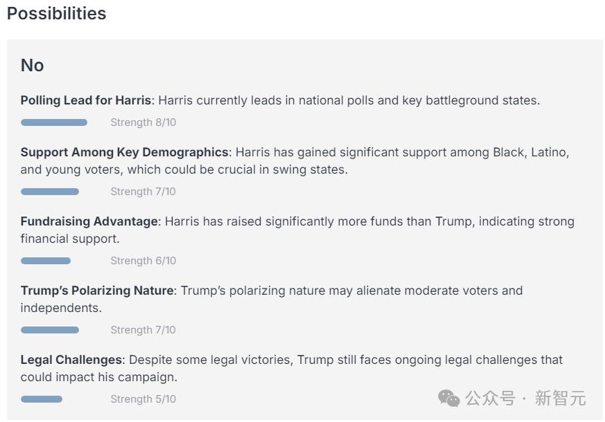 反面的论据也有5个,同样现实且有力,包括Harris民意调查领先、筹款优势和关键人群的支持,以及Trump本人的极化倾向和法律挑战。