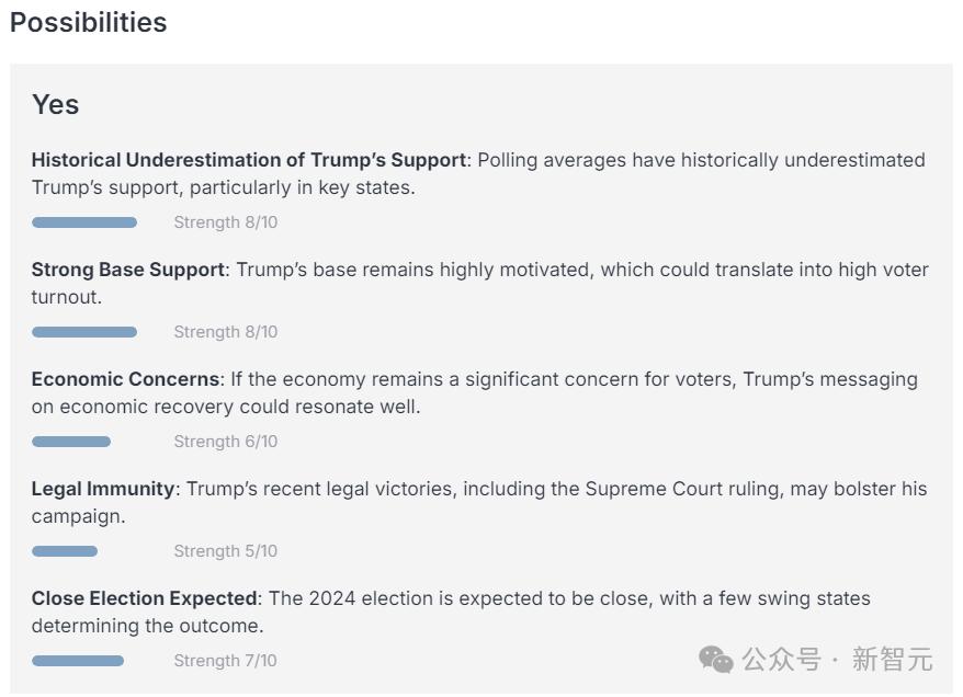 比如,预测Trump当选的论据包括:票仓强劲、支持率经常被低估、刚获得的法律豁免权、他主张的经济复苏措施等等。