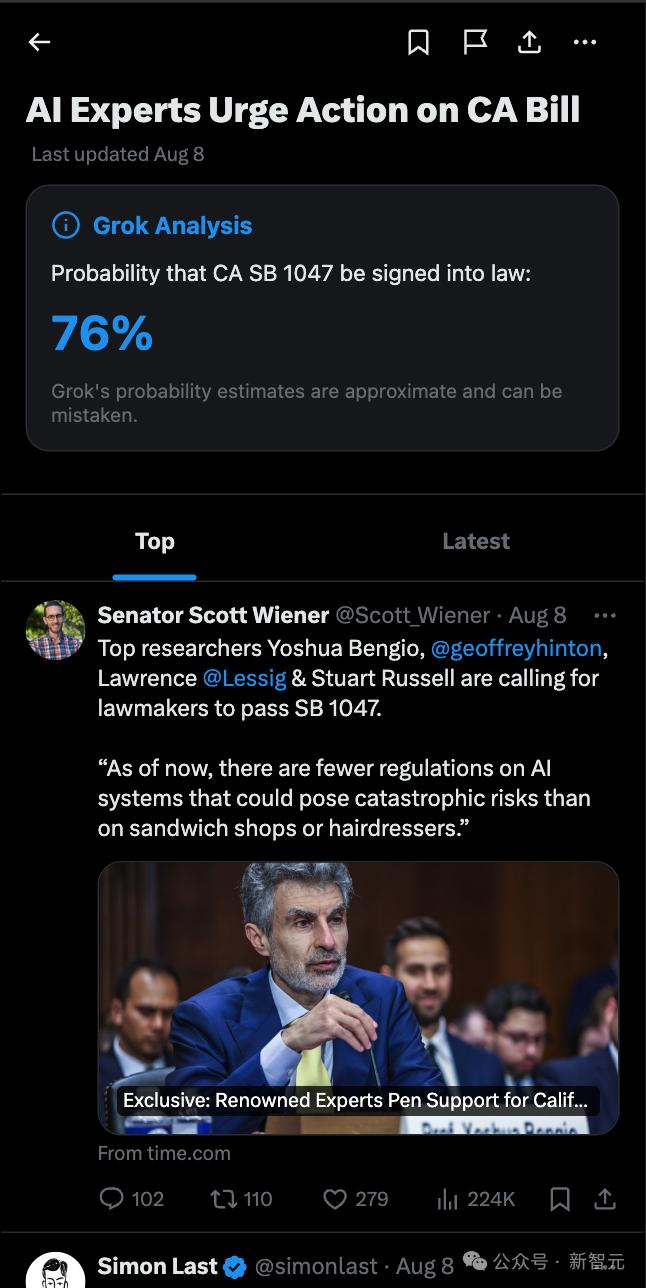 AI预言家还可用来补充新闻报道,比如帮助预测加州AI安全法案SB 1047成功签署的可能性。