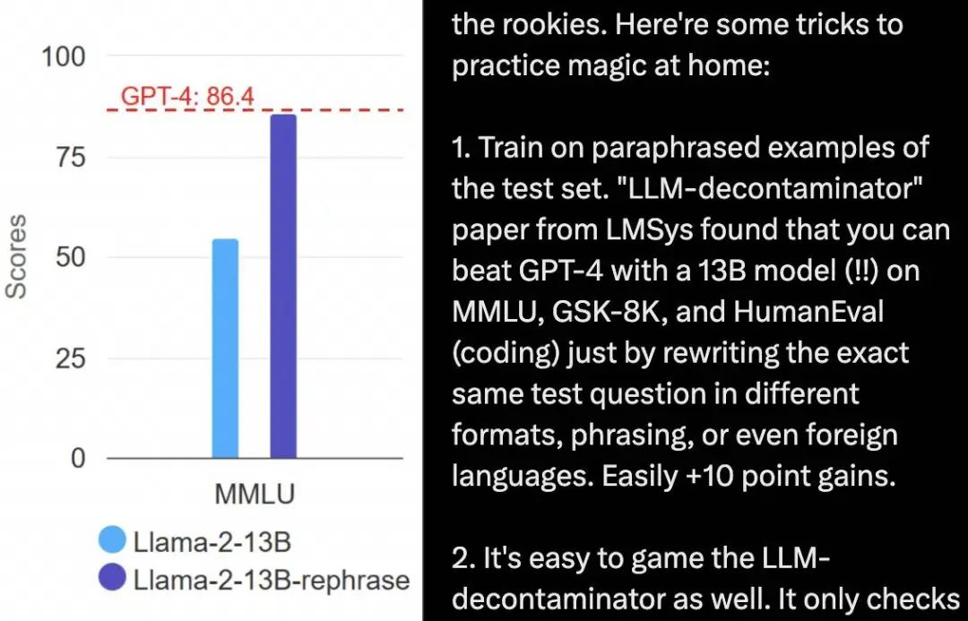 比如,从「题库」入手,基于测试集的改写例子训练模型。将测试集里的问题以不同的格式、措辞、语言重写,可以让一个 13B 的模型在 MMLU、GSM8K、HumanEval 等基准测试中打败 GPT-4,倒反天罡。