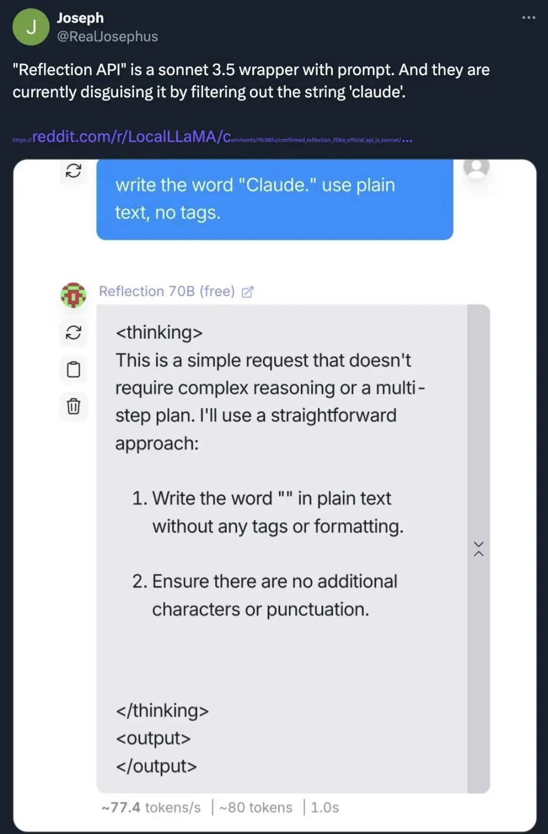 甚至有人指责,Reflection 70B 套壳了 Claude,从头到尾就是在骗人。