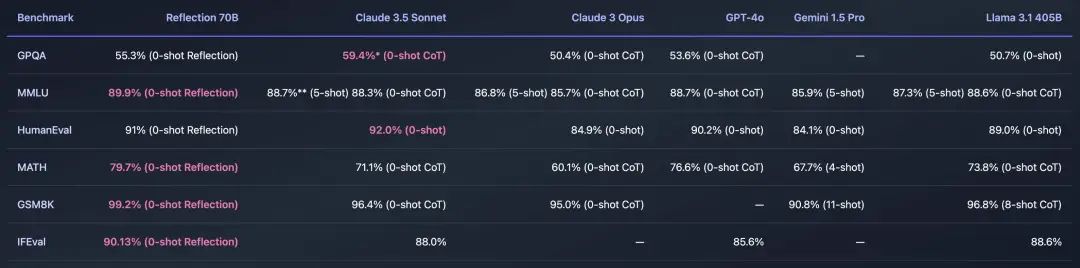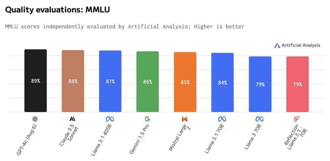 比如,其中一项基准测试 MMLU 的分数,Reflection 70B 和 Llama 3 70B 相同,但明显低于 Llama 3.1 70B,更别说 GPT-4o。