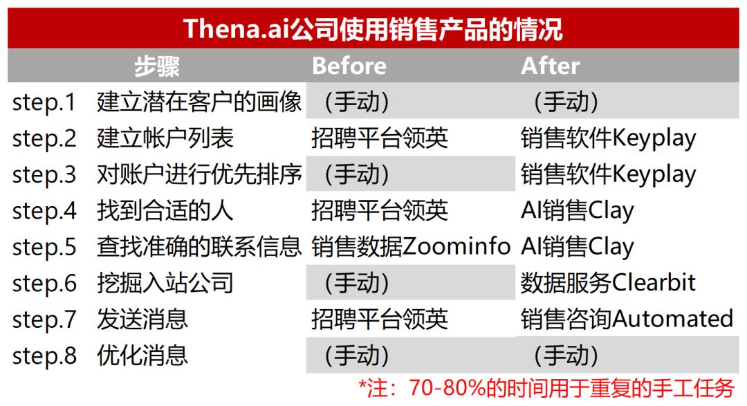 例如,一家名叫Thena.ai的公司在不聘用SDR(销售发展代表)和BDR(业务发展代表)的情况下,仅通过AI销售产品便就实现了5~10名销售代表的产出!