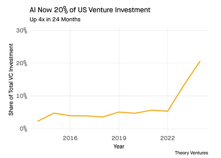 当风险投资总额减少,AI投资占比又激增,导致的结果就是挤压对其它行业的投资。