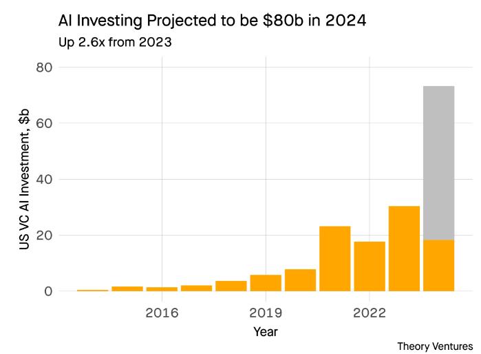 美国AI投资额还在增加。根据Redpoint Ventures风投合伙人Tomasz Tunguz的数据,2024年美国风险投资对AI的投资额将超过800亿美元,比2023年增长2.6倍。