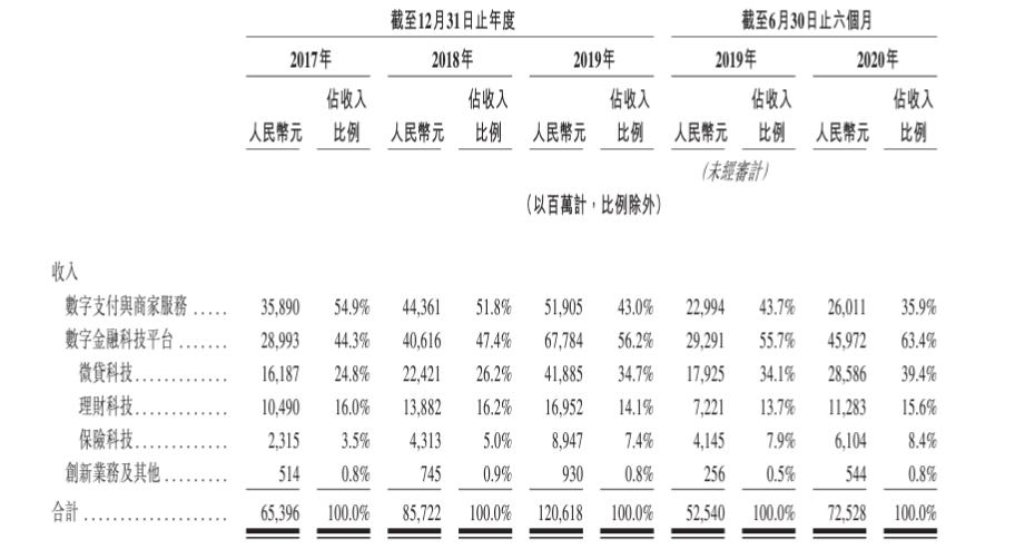 翻看当时的招股书,蚂蚁主要收入分为数字支付与商家服务、数字金融科技平台(包括微贷科技平台、理财科技平台、保险科技平台)、创新业务及其他三大块。2020上半年,前两大业务的营收占比分别为35.86%、63.39%。