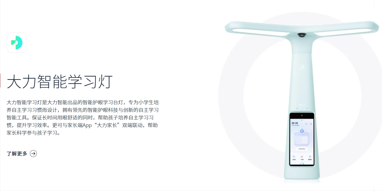 据晚点LatePost爆料,台灯之外,字节还在研发教育平板、口袋学习打印机、儿童早教机、词典笔等多款教育硬件。但截至目前,大力教育官网产品一栏只有大力智能学习灯的身影。