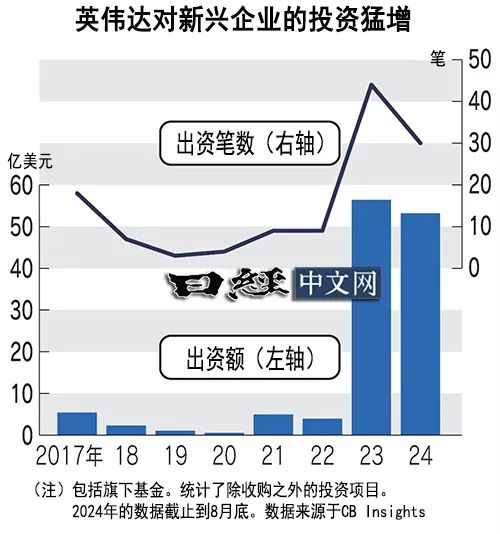 取代风投企业成为风险资金供应源的是英伟达等业务公司。据美国CB Insights统计,英伟达在2023年1月到2024年8月的不足两年时间里,向初创企业进行了74笔投资,注入了总额超过109亿美元的资金。这一规模与美国大型风投企业相当,超过了日本国内年度风险投资额的5倍。