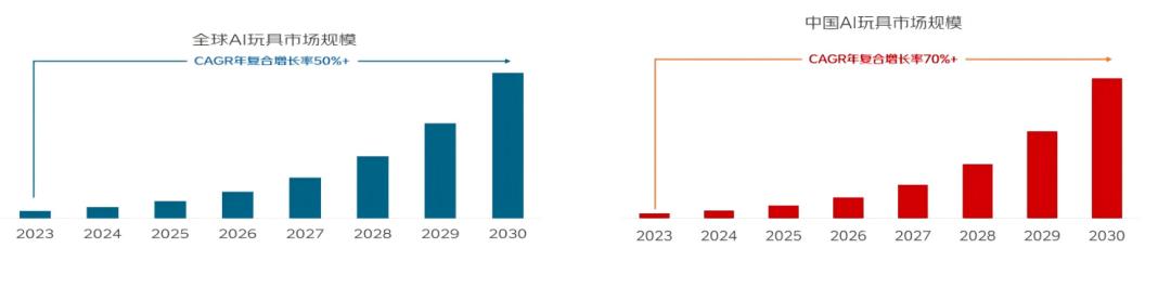 据《AI玩具消费趋势白皮书》的数据,仅以中国市场为例,AI玩具市场年规模预计突破十亿元,随着近几年算力指数级提升、训练成本的进一步下滑,推断2030年将进一步突破百亿规模,年复合增长率CAGR超过70%以上。