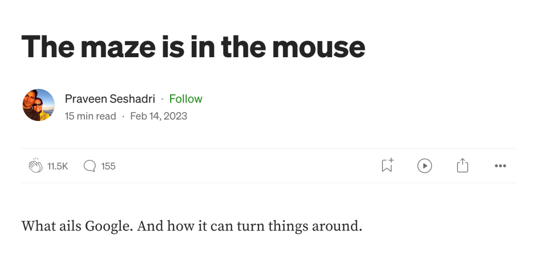 AppSheet 创始人 Praveen Seshadri 宣布离开谷歌,他的博客称,公司已迷失方向,员工被困在系统里。