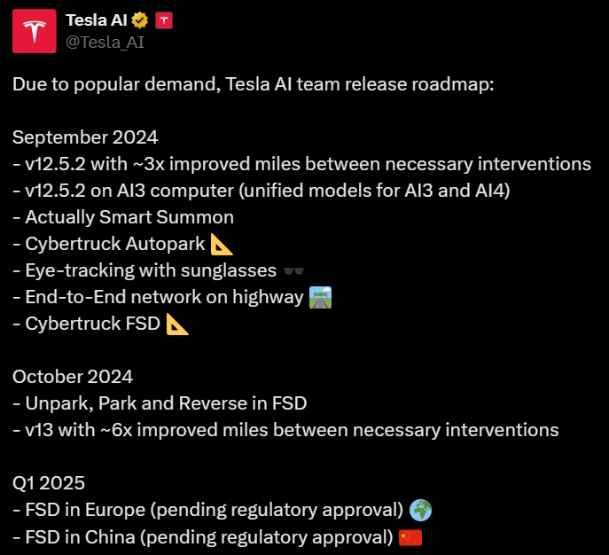 特斯拉旗下子公司Tesla AI的官方X账号9月5日发布了一份发布路线图,概述了即将推出的技术。