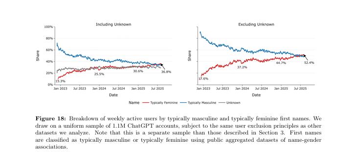 研究发现,在ChatGPT于2022年底至2023年初迅速走红时,约80%的用户使用的是通常被视为男性化的名字。然而到了2025年6月,这一比例出现逆转:52%的ChatGPT用户使用了女性化的名字。