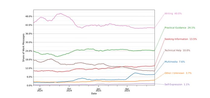 OpenAI估计,约49%的ChatGPT消息属于“询问”,40%属于“执行”,11%属于“表达”。但在工作场景中,截至2025年7月,“执行”类消息占比达56%,其中近75%与写作任务相关。
