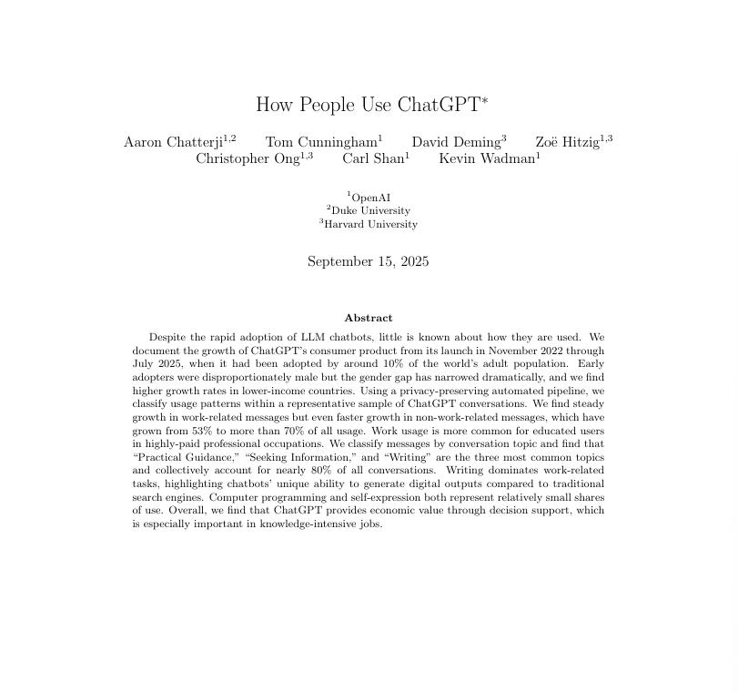 美国当地时间9月15日,OpenAI经济研究团队联合哈佛大学与杜克大学的经济学家,共同发布了首份ChatGPT用户行为研究报告《人们如何使用ChatGPT》。这项研究首次从群体层面揭示了人们在不同时间和不同任务中如何使用ChatGPT。