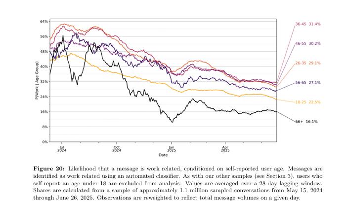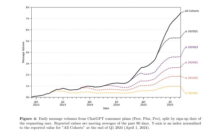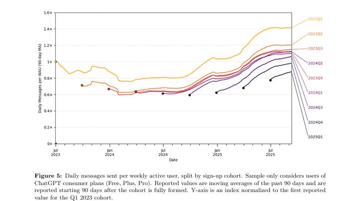 然而,自6月以来,老用户(2025年第一季度或之前注册的用户)的人均消息率在整整三个月内保持平稳。最近一个季度的总使用量增长完全由4月以来注册的新用户推动,其中许多人仍处于对这款大语言模型的初步探索阶段。