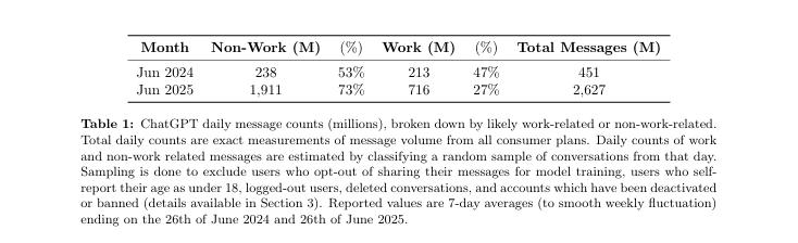 值得注意的是,虽然工作相关消息量保持稳定增长,但非工作类消息增长更为迅速,其占比从最初的53%上升至目前的逾70%。此外,高学历、高收入的专业人士更倾向于将ChatGPT用于工作场景。